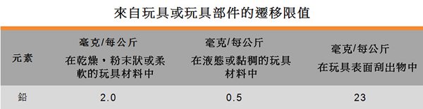 铅的现行限值为:干燥的玩具材料(例如粉笔)中为每公斤(kg)13.5毫克(mg),液态或黏稠的玩具材料(例如手指画颜料)中为每公斤3.4毫克,玩具表面刮出物(例如涂料)中为每公斤160毫克。